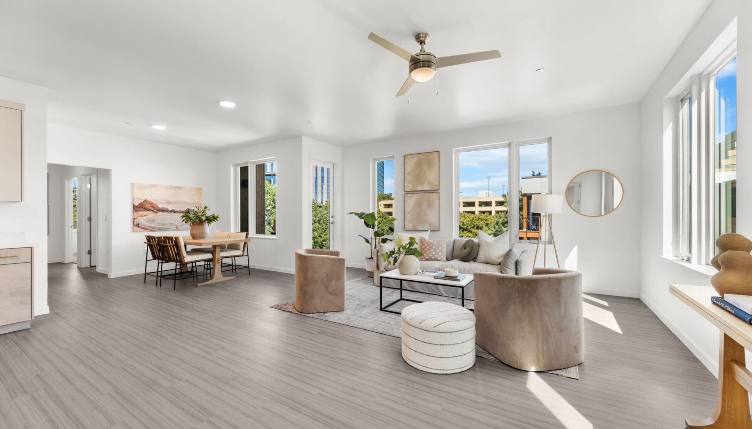 The Washington Commons project is a 35-unit co-housing building with community spaces, including a fitness center, dog washing station, common dining area, and outdoor terrace. The project is a four-story courtyard design, featuring a centrally-located, open air courtyard. The complex includes two covered parking garages.